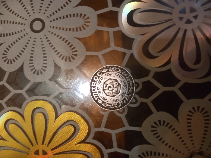 A close-up displays a Moroccan 5 Francs coin. The coin is silver, with intricate Arabic script encircling a central design of a star with "5 FRANCS" inscribed within. It rests upon a patterned surface, featuring stylized flower designs in gold and shades of brown and white, against a honeycomb background. Light reflects unevenly across the surface, highlighting the coin's details and the surrounding floral pattern.