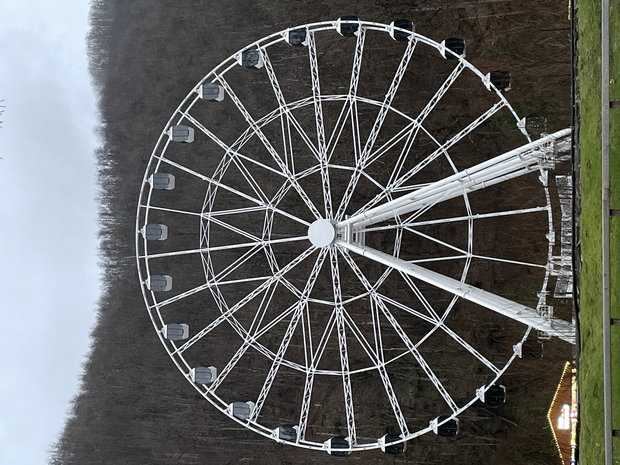 Ferris wheel located in Estosadok, Russia. The wheel is white and has passenger cars attached to its circumference. In the background is a tree-filled hillside on the left and some grassy terrain to the right of the image. There is a structure with colored lights visible to the lower right of the frame. The sky is overcast.
