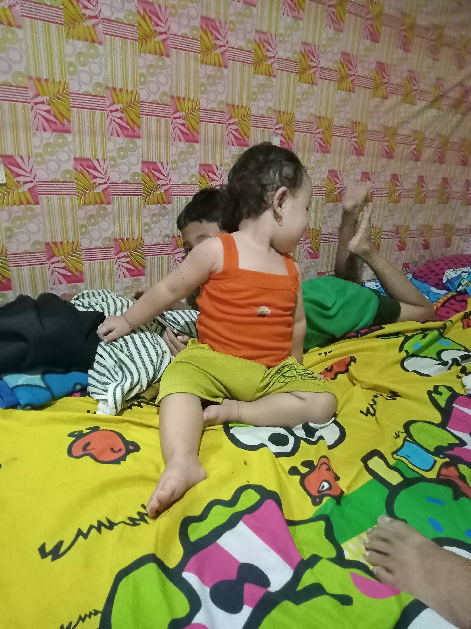 This image captures an indoor scene within a residential property in Bungur, Indonesia. The background features a wall covered in patterned wallpaper, displaying a repetitive design of vertical stripes, circular motifs, and stylized leaves in shades of pink, yellow, and light green. In the foreground, a young child, appearing to be a toddler, sits cross-legged on a brightly colored yellow bedsheet adorned with large, abstract, cartoon-like designs in green, pink, black, and red. This child wears an orange sleeveless top and light green shorts; a small gold hoop earring is visible in their left ear. The child is oriented towards the right side of the frame, with their left hand extended forward. Adjacent to this child, a second individual, likely another child, is partially visible lying down on the bed. This individual is covered with a black and white striped garment over dark clothing, and the first child's left hand is resting on or interacting with their midsection. To the far right of the frame, a third individual, presumed to be a child, is seen lying prone on the bed. Only their lower legs and bare feet are visible, clad in green shorts, resting on a multi-colored pillow. A small pile of folded clothing, including black and blue items, is situated on the bed to the left of the second child.