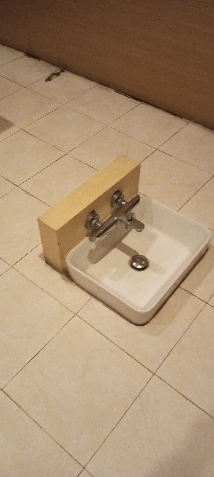 - "The scene, set indoors in Aral, Kyrgyzstan, presents a low-mounted sink assembly positioned on a light beige tiled floor against a dark brown wall" by FM-lrapi1, licensed under CC BY 4.0