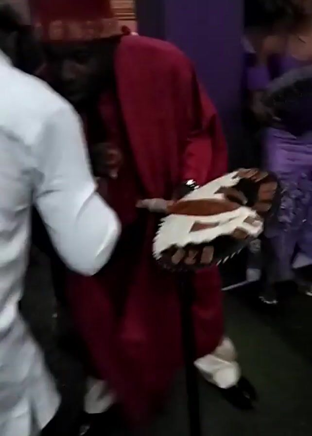 A close-up, blurry video shows a man in a maroon robe and patterned headpiece lying on a green surface. Other people are visible, including one in a purple dress seated on a purple surface and one in a white shirt. Someone touches the man in the robe. Various personal belongings are scattered around the area. The focus shifts erratically, making it difficult to discern details.