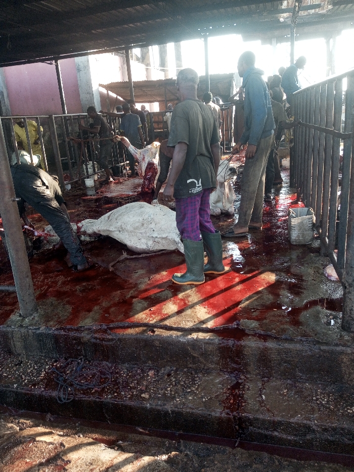 In a dimly lit slaughterhouse, numerous men surround animal carcasses. One carcass lies on the ground amidst a pool of blood, while another hangs from a railing. A man in green boots and plaid pants stands near the scene. The concrete floor is stained red with blood, and sunlight streams through the gaps in the roof. The environment appears unsanitary and chaotic.