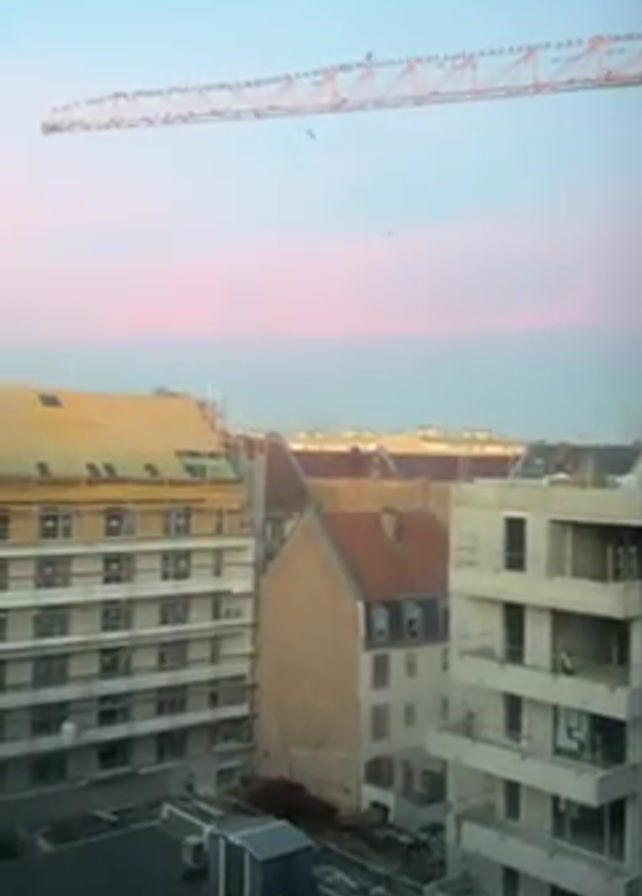 n urban landscape at dusk, with a pale pink and blue sky. Buildings, in various stages of construction and repair, dominate the view. Scaffolding is visible on some buildings. A construction crane sits atop buildings with many birds perched on its arm. Several dark spots are moving in the sky, possibly birds in flight. The video is taken from an elevated vantage point, likely from a window.