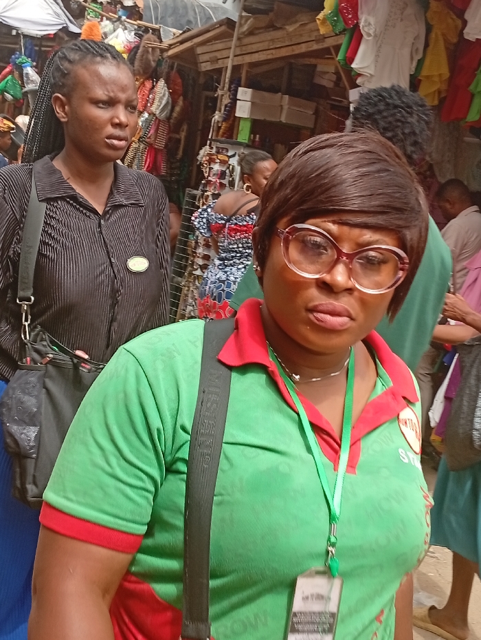 Two women stand in what appears to be a bustling outdoor market. The woman in the foreground wears a green and red polo shirt, glasses, and has a lanyard around her neck. She has a dark brown bob and looks directly at the viewer. The woman behind her wears a dark, vertically striped shirt and also has a lanyard. Both women have bags slung over their shoulders. Market stalls with various goods, clothing, and accessories are visible in the background.