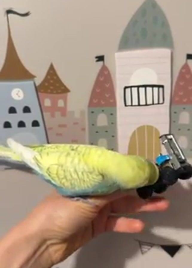 A close-up shot shows a person holding a small, yellow and blue parakeet in their outstretched hand. The parakeet is biting a small, blue and black toy tractor held in the person's palm. The parakeet pecks at the toy with its beak, emitting chirping sounds. Behind the person and bird, the wall is decorated with a cartoonish castle pattern in shades of grey, pink, and tan. The person wears a wristwatch on their left wrist.