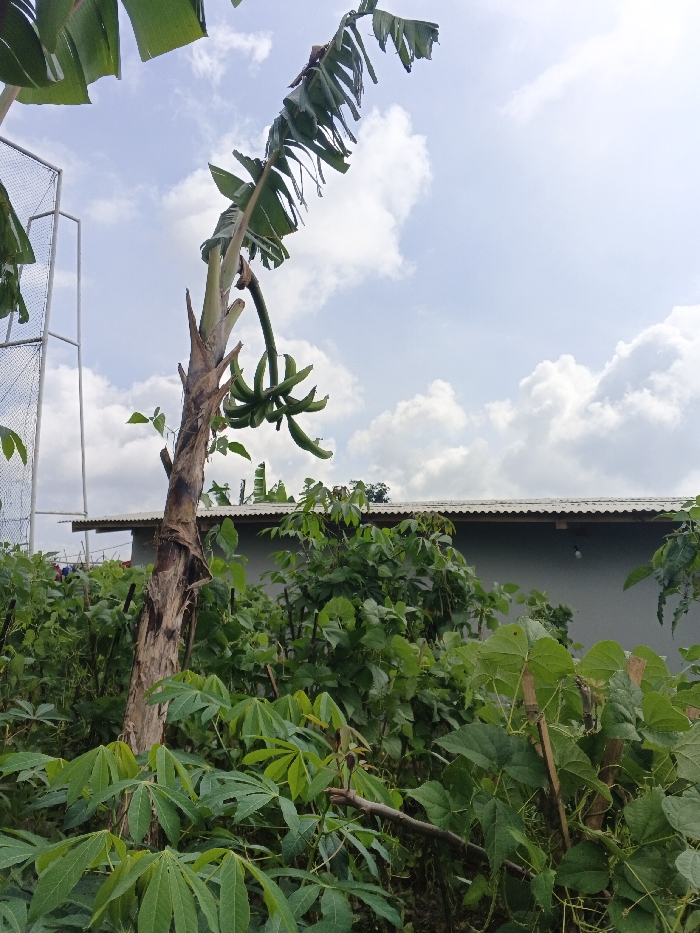 An outdoor scene in Maw Hit, Myanmar, depicts a dense arrangement of vegetation under a partly cloudy sky. A prominent banana plant (Musa genus) occupies the center, featuring a textured pseudostem and large, green leaves, some exhibiting wilting. A cluster of green, unripe bananas hangs from its upper stalk. The foreground and midground are filled with various green plants, including broad-leafed plants resembling cassava in the lower left, and other leafy growth, some supported by stakes. In the background, a light gray building with a corrugated metal roof is visible, situated below the horizon line. A small, white light fixture is mounted on the building's wall. To the far left, a metallic mesh or bar frame structure is partially visible. The upper two-thirds of the image show a light blue sky with scattered white cumulus clouds. No individuals are present.