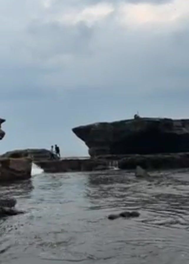 rocky beach scene on a cloudy day. Two people stand on a rock formation close to a larger, flatter rock with something on top, possibly a small structure. Waves crash against the rocks. The tide appears to be low, revealing more of the rocky terrain. The water is dark and the sky is overcast. The overall impression is one of a moody, natural seascape.