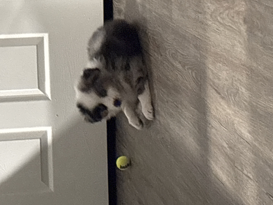 A fluffy, grey and white dog is lying on a light brown wood-look floor next to a white door. The dog faces the door and has a yellow tennis ball beside it. The room is dimly lit, casting shadows across the floor and door. The focus is on the dog, its fur appearing soft and slightly blurred. The floorboards run parallel to the dog's body, creating a linear pattern.