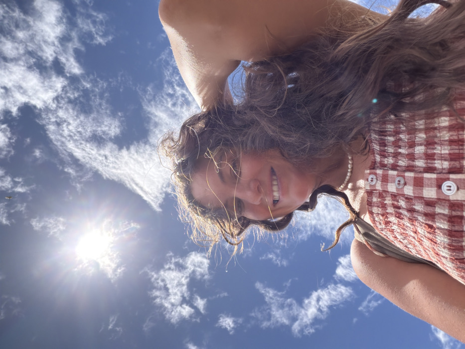 From a low-angle perspective, a woman with curly brown hair smiles, partially obscuring a bright sun in a blue sky dotted with wispy clouds