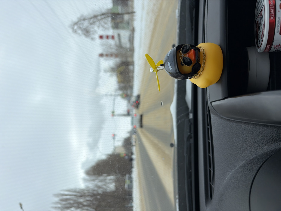 The image displays a daytime winter scene from the interior of a vehicle on a major road in Lipetsk, Russia, in the vicinity of the Novolipetsk Steel (NLMK) plant. In the foreground, a dark, textured plastic dashboard occupies the lower portion of the frame. Centered on the right side of the dashboard is a yellow rubber duck figurine. This duck wears a black helmet with a yellow propeller mounted on top, small round sunglasses, and a gold-colored chain around its neck. Below the duck, within a dashboard compartment, a white circular container and a red and white metal tin with Russian text, including "ЖЕВАТЕЛЬНАЯ" (chewing/masticatory) and "NEW FORMAT," are partially visible. Through the windshield, a multi-lane asphalt road extends into the distance. The road surface is partially covered with snow and brown slush, with tire tracks visible in the cleared sections. Several blurred vehicles are present on the road, some with illuminated red taillights, suggesting they are stopped at traffic lights. Multiple traffic lights are visible further down the road, displaying red signals. The roadside and median are covered with snow, and bare deciduous trees line both sides of the road. The background features an overcast, grey sky. On the far right, two tall, reddish-brown industrial chimneys are prominent, characteristic of the Novolipetsk Steel plant. Additional blurred trees and distant structures are present behind the road. No individuals are explicitly identifiable in the scene.