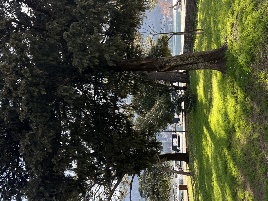 The image depicts a waterfront park area in Kotor, Montenegro, under clear daylight conditions. The foreground features a vibrant green lawn covered in grass and scattered small white flowers, exhibiting strong sunlight and cast shadows from overhead trees. Multiple mature trees, predominantly evergreens with dense, dark green foliage, occupy the midground and frame the scene. A large tree trunk, thick and gnarled, is prominent in the right foreground. Beyond the grassy area and trees, a paved promenade or pier runs horizontally. Visible on this promenade are a brown, cylindrical trash receptacle and a white informational sign or marker. Moored adjacent to the promenade in a body of water, consistent with the Bay of Kotor, are several boats and yachts. One white motor yacht with a dark canvas cover over its cockpit is clearly visible. The water surface shows reflections of light. In the background, distant hills or mountains rise from the far side of the bay under a bright sky, with some faint structures visible along the shoreline. No individuals or animals are present, and no active interactions are depicted. The scene is static and well-lit, suggesting either morning or late afternoon sun.