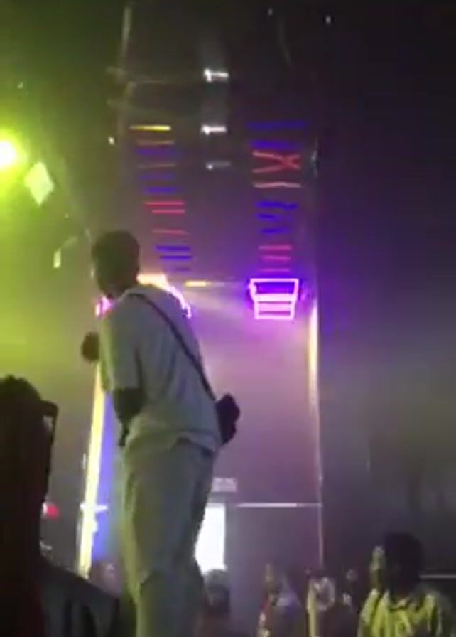 The video depicts a person on stage performing in a nightclub or similar venue. The stage is illuminated with colorful lights, including yellow, green, purple, red, and blue hues. The performer is wearing light-colored clothing and holding a microphone, moving and gesturing while seemingly interacting with the crowd. In the foreground, several people are visible, presumably audience members, some with their backs turned to the camera. The environment is dark and crowded, suggesting a lively atmosphere with music and a performance.