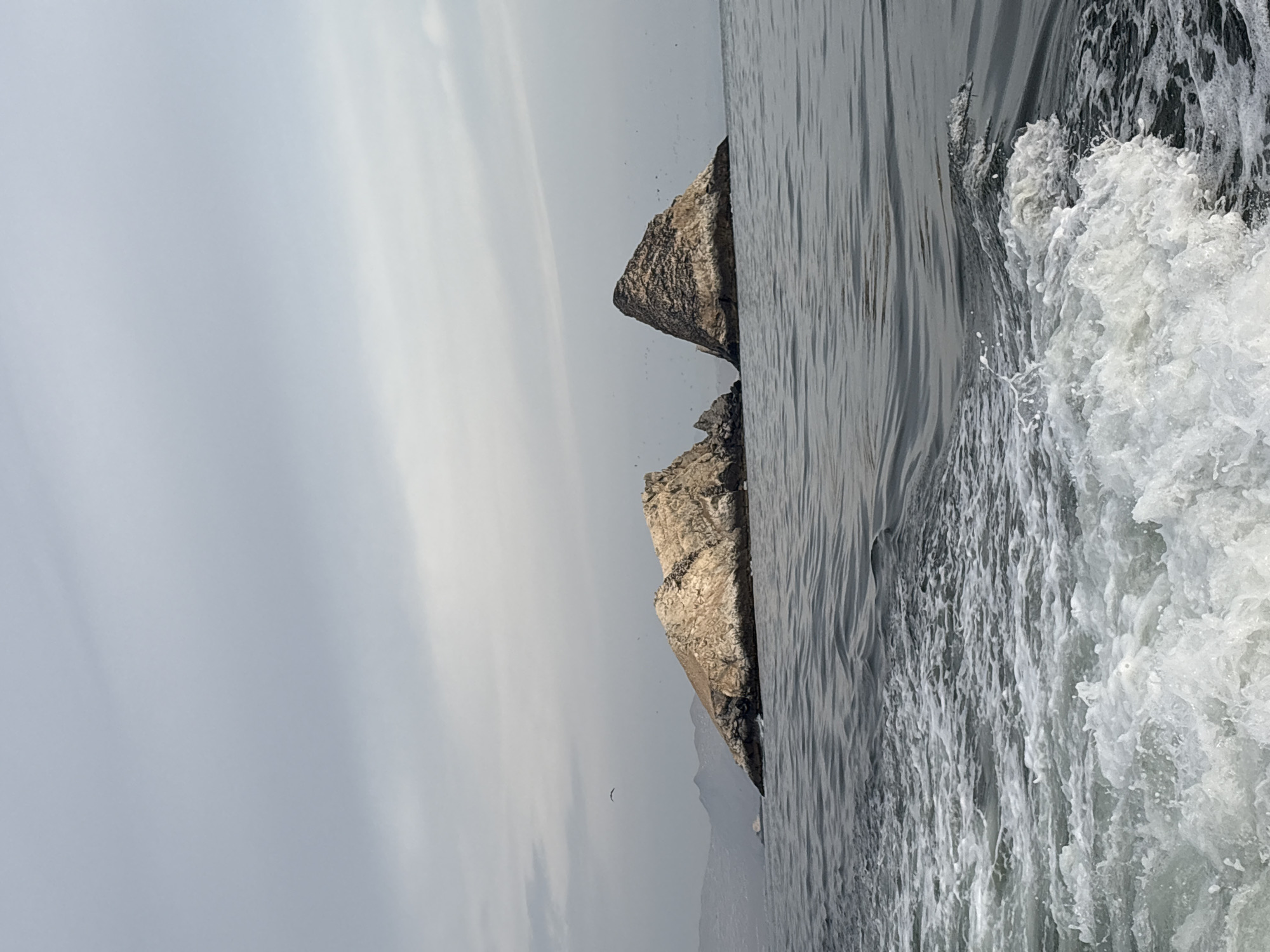 The scene depicts a marine environment off the coast of Ancón, Peru, under an overcast sky. The immediate foreground shows turbulent white foam and waves, indicative of a boat's wake. The water beyond the wake is dark grey with rippling textures. In the midground, two prominent rocky islets rise from the water. The islet on the left is larger and more elongated, while the one on the right is distinctly conical. Both islets are light brown and off-white in color, suggesting significant guano deposits, and are heavily populated with numerous small, dark birds. Additional birds are visible flying in the vicinity of the islets and a single bird is distinctively visible in flight in the upper left quadrant. Faint, hazy landmasses are visible on the distant horizon to the left. No human figures or specific man-made objects are present in the frame, apart from the implied vessel creating the foreground wake.