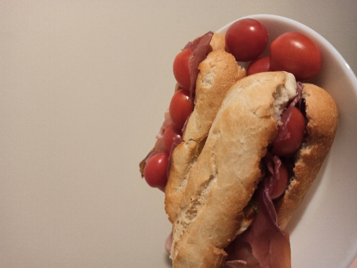 - "In the city of Unknown, Unknown, the scene depicts a close-up, elevated view of two prepared sandwiches and loose cherry tomatoes on a white plate" by FM-zekn93, licensed under CC BY 4.0
