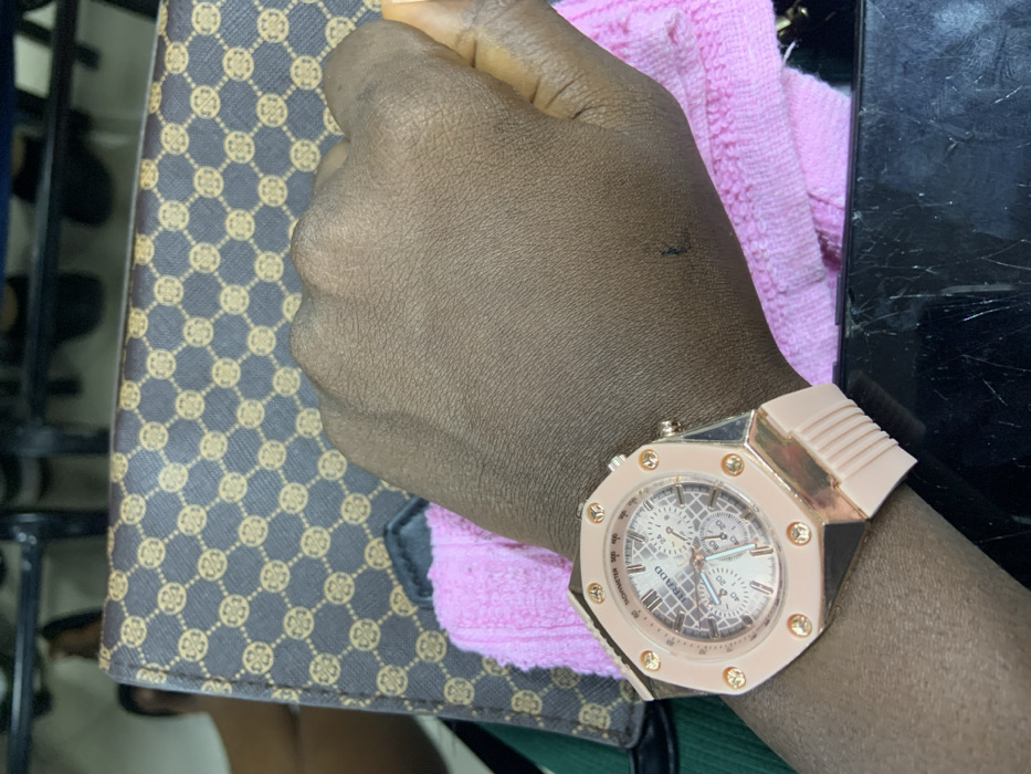 A close-up, high-angle image displays a human hand with a dark skin tone, seen from above the wrist, in Idimu, Nigeria. The hand wears a rose gold-toned "RHEADO" wristwatch featuring an octagonal bezel with gold-colored accents, a light-colored multi-dial face with a textured center, and a matching peach or rose gold-toned ribbed strap. The hand rests upon a pink, terry-cloth-like fabric which partially covers a dark, scratched surface below. In the blurred background, behind the hand and cloth, is a brown wallet or bag adorned with a repeating pattern of light brown interlocking geometric shapes. The overall scene appears to be an indoor setting.