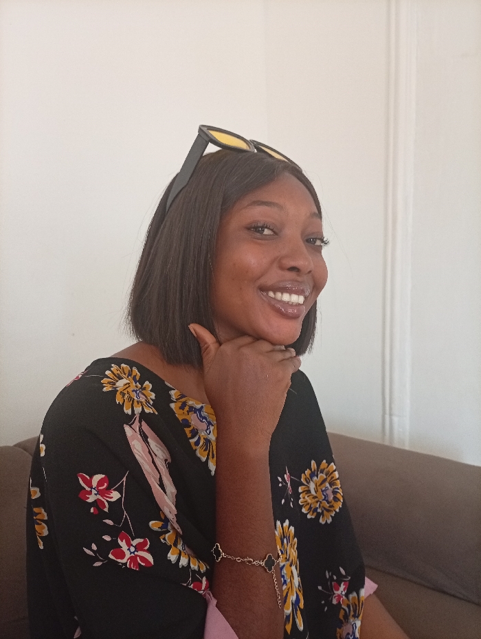 A single adult female is depicted from the chest up, seated on a brown sofa in an indoor environment. The background consists of a plain white wall with vertical architectural trim visible on the right. The female has dark skin, dark, straight, short hair, and is smiling broadly towards the viewer. Yellow-lensed sunglasses are positioned on top of her head. She is wearing a black garment adorned with a floral pattern in red, yellow, and white, with a pink undershirt or lining visible near the right arm. Her right hand is raised, with the thumb positioned under her chin and fingers curled. A gold-toned bracelet with black four-leaf clover charms is present on her right wrist. The location is an interior room in Unknown, Unknown.