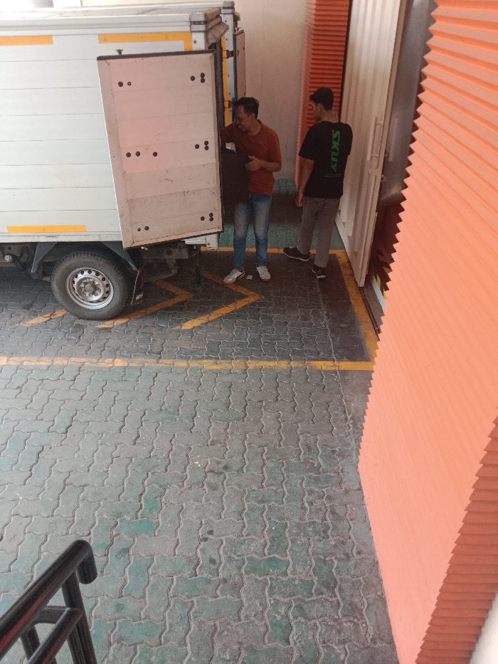 Two men stand near a delivery van. One man in a brown shirt and jeans opens the van's rear door. The other man, wearing a black shirt with green lettering and grey pants, stands beside him. The van is parked on a brick-paved area with yellow lines marking the space. A peach-colored, textured wall borders the right side of the frame. A railing is visible at the bottom left corner.