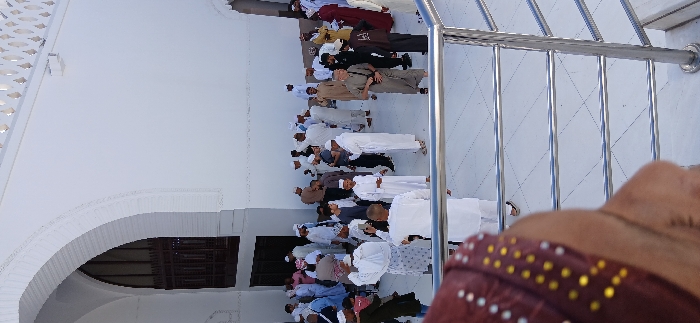 The image displays an outdoor scene within a bright white architectural complex, specifically identified as a courtyard or entrance area of Masjid an-Nabawi (The Prophet's Mosque) in Medina, Saudi Arabia. The environment is dominated by white structures, including a prominent arched doorway on the left leading into a darker interior with a visible dark, possibly wooden, gate. An ornate white balustrade with a repeating pattern is visible along the upper edge of the building on the right. The ground is paved with light-colored, possibly white or light grey, tiles arranged in a grid pattern. Approximately 30-50 individuals are present, primarily adult males of varying ages, with a few children and women, mostly in the background. The majority of men wear traditional Islamic attire, including long white robes (thobes/dishdashas) and white skullcaps (kufis). Some individuals are seen in light brown, beige, or blue thobes, while at least one man wears a grey t-shirt and dark pants. People are generally congregated, standing, walking, and interacting in small groups. No specific organized activity is discernible. Several individuals are holding mobile phones, and one man in a light brown thobe near the center-right is holding a camera or similar device with a strap. In the immediate foreground, obscuring the bottom left of the frame, is the top of a person's head and shoulder, wearing a brown garment adorned with gold and white spherical embellishments. A silver-colored metal railing with four horizontal bars runs across the bottom portion of the image, from left to right, indicating an elevated or partitioned viewing position. The scene is brightly lit by natural daylight, casting soft shadows.