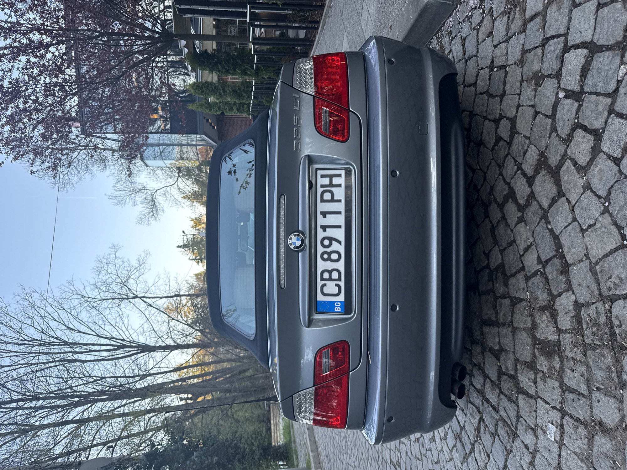 A gray BMW 325 Ci convertible is parked on a cobblestone street. The license plate reads "CB 8911 PH" and has a "BG" identifier. The car's rear is facing the camera. The background includes leafless trees, buildings, and greenery, which may suggest a residential area or park in Bankya, Bulgaria.