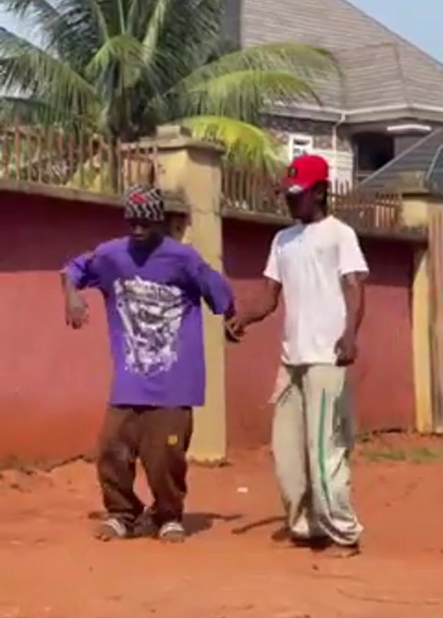 Two men dance outdoors. One wears a purple t-shirt, brown pants, and a hat. The other wears a white t-shirt, loose white pants with green stripes, and a red baseball cap. They dance on a dirt surface in front of a low brick fence. A palm tree and a large house are in the background.