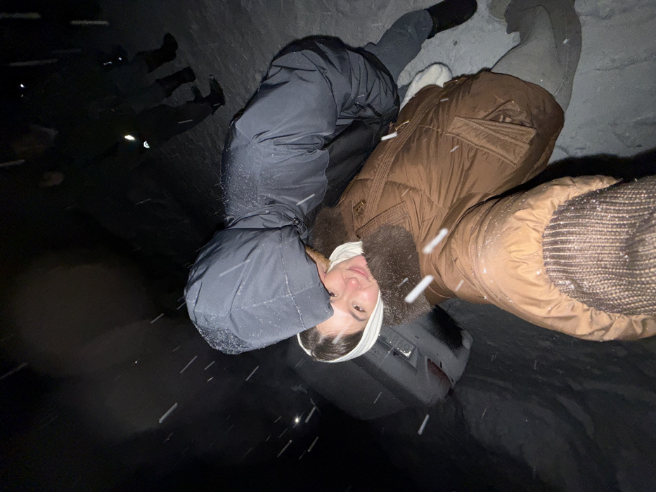 The image captures a nighttime scene in 3 Госконезавод Центральная усадьба, Russia, during active snowfall. In the immediate foreground, a person, likely female, wears a brown puffer jacket with a fur collar and a white head covering. This individual is looking directly at the camera, holding it in an extended right hand, suggesting a selfie perspective. Snowflakes are visible on their jacket. Positioned behind and slightly above this individual is a second person, wearing a dark hooded winter jacket, with their face not visible. Snowflakes are present on their hood. In the darker background, several indistinct figures are observed standing. One of these figures exhibits a reflective strip on their lower leg. A light-colored vehicle, appearing to be a car, is partially visible in the left mid-ground, with its rear section and what appears to be a license plate area partially obscured by darkness and accumulated snow. The ground is uniformly covered in a layer of snow, and falling snow is evident throughout the entire frame, appearing as streaks and dots against the dark environment.
