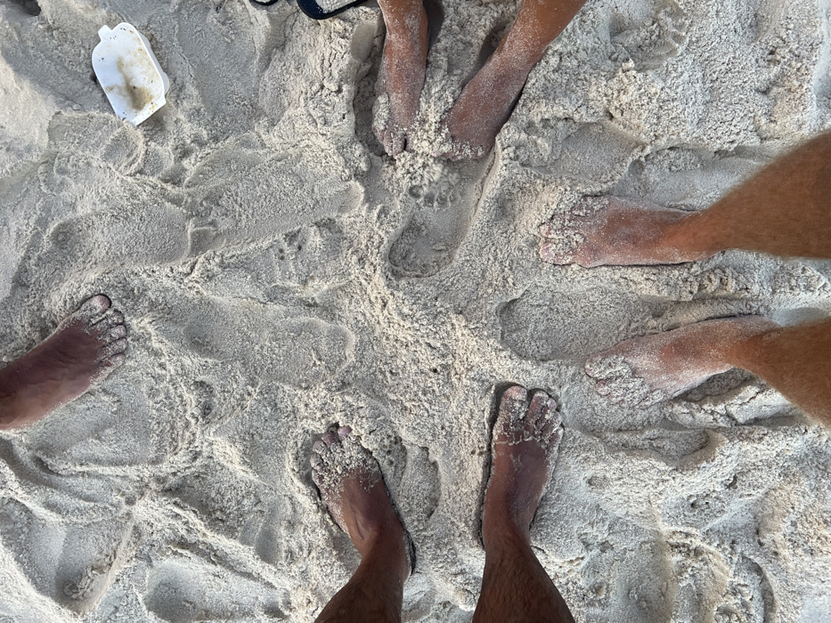 A top-down view of feet in the sand