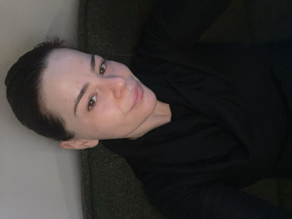 A female individual is depicted in a self-portrait or close-up shot, facing the camera with a slight smile