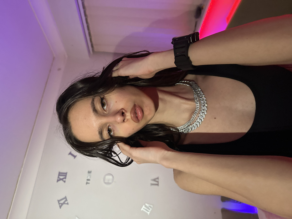 A young adult female is depicted from the chest up, posing indoors. She has long, dark, wavy hair, fair skin, and light brown eyes, looking directly at the camera. Her lips are slightly parted and glossy. She wears a black tank top, two layered silver-toned necklaces resembling cuban link chains, and a black digital wristwatch on her left wrist. Both hands are raised to the sides of her head, with fingers touching her hair. The background consists of a white wall decorated with scattered silver Roman numerals (XI, XII, I, II, III, VIII, IX) and the word "TIDE." Below "TIDE," a circular decorative element is visible. The room is illuminated by colored ambient lighting, featuring a purple glow from the upper left, a prominent pink/red LED strip along the lower right, and a subtle blue light in the far-left background, illuminating a portion of furniture. A light-colored curtain is visible in the right background. The specific location within Corby, United Kingdom, cannot be determined from the visual information provided in the image.