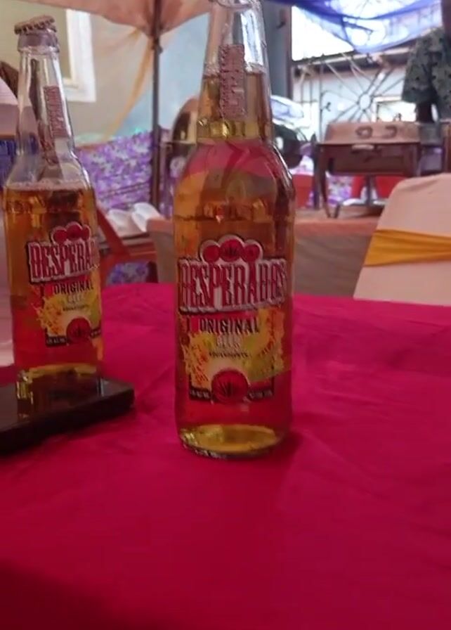 two unopened bottles of Desperados Original Beer on a red tablecloth. The camera zooms in on one bottle, highlighting the logo. The background includes a tent-like structure, a person standing near a catering cart, and chairs. The audio captures indistinct speech and ambient sounds.