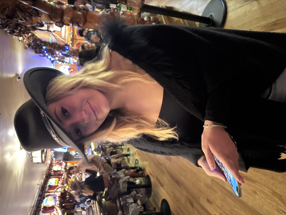 A fair-skinned woman with blonde hair and a black cowboy hat gazes at the viewer, holding a cell phone. She is wearing a black top and a dark cardigan or shawl with fur trim. Behind her, a bar is visible, populated with patrons and decorated with lights. The scene suggests a festive or nighttime setting.