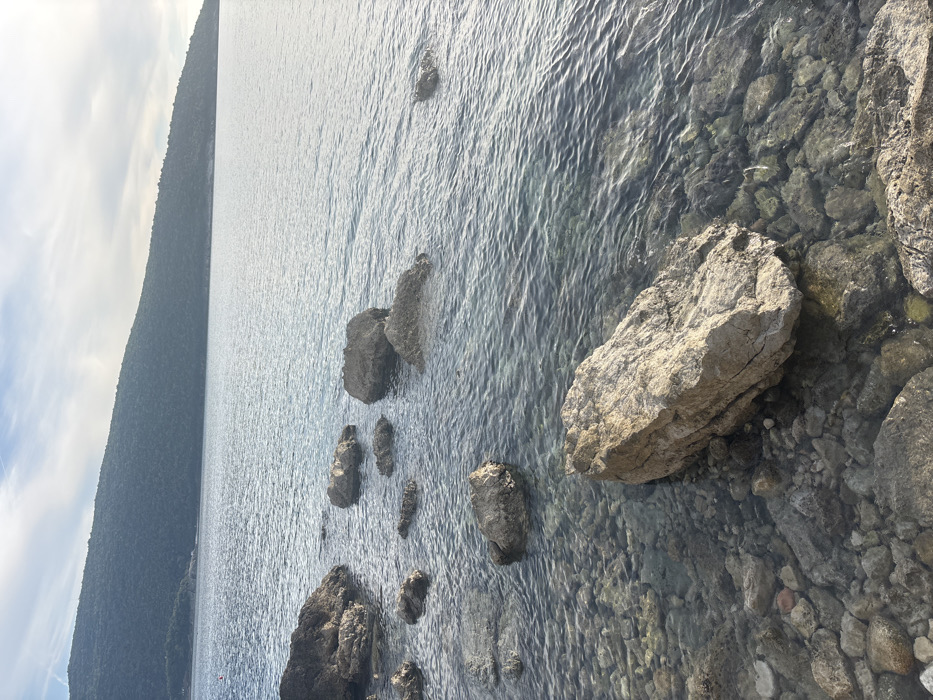 This image depicts a coastal scene in Kruče - Kërruçi, Montenegro, viewed from a low perspective near the waterline