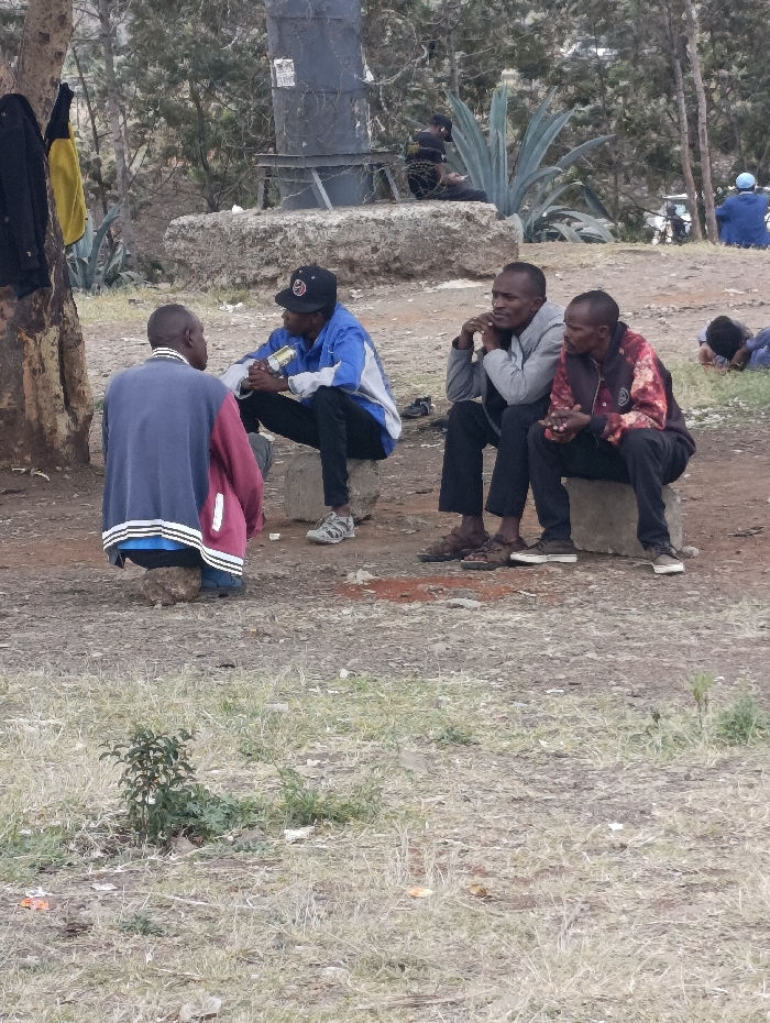 An outdoor scene in Matungulu west ward, Kenya, depicts six individuals in varying states of gathering and rest on dry, patchy ground with sparse vegetation. In the foreground to midground, four men are clustered. One male, wearing a blue and maroon long-sleeved shirt and blue shoes, is squatting on a small stone with his back partially to the viewer, facing the others. Opposite him, a male wearing a blue and white athletic jacket, black pants, a black baseball cap, and grey athletic shoes, sits on a rectangular grey stone block, holding a metallic can in both hands. To his right, another male in a grey hooded sweatshirt, black pants, and dark sandals, sits on a similar stone block with his hands clasped under his chin. Adjacent to him, a fourth male wearing a dark red, black, and white patterned long-sleeved shirt, black pants, and dark low-top shoes, also sits on a grey stone block with his hands clasped. These four individuals appear to be engaged in an interaction or discussion. In the mid-background, to the left, a dark jacket and a yellow garment hang from a tree trunk. Behind the main group, a dark, cylindrical metal structure, possibly a utility component, is visible atop a large, irregular stone base, partially obscured by trees. Large agave-like plants are present in the background. Further back, two additional individuals are visible: one wearing blue clothing, partially obscured, appears to be resting on the ground to the far right, and another individual in dark clothing is lying on a larger stone structure behind the main group. The ground consists of dry grass, bare earth, and scattered small debris. The sky is overcast.