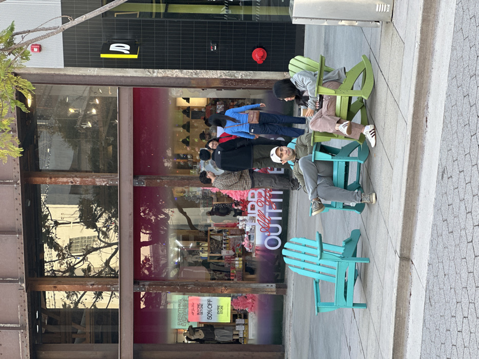 A retail storefront with large glass windows displays a clothing store with sale signs. Three Adirondack chairs in green and blue shades sit outside on the sidewalk. Several people are seated or standing near the chairs. A red fire alarm box is affixed to the building's black tile exterior. A tree is visible to the left of the building.
