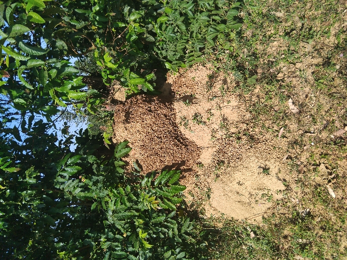 A large termite mound dominates the landscape, its sandy texture contrasting with the surrounding green foliage. The mound is situated at the base of a tree, partially obscured by its leaves. Adjacent to the mound, sparse vegetation grows in the sandy soil, hinting at the arid conditions of the environment. The overall scene showcases nature's intricate relationship between plant life, insect activity, and the earth.