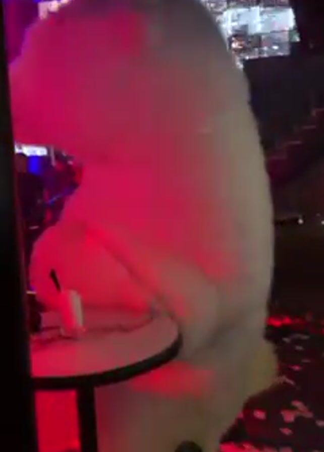 person in a polar bear costume at a nightclub. The person in the polar bear costume is next to a small table with a drink on it. The nightclub has red and blue lights and confetti on the floor. A security guard and other people are visible in the background. The person in the polar bear costume interacts with other people.