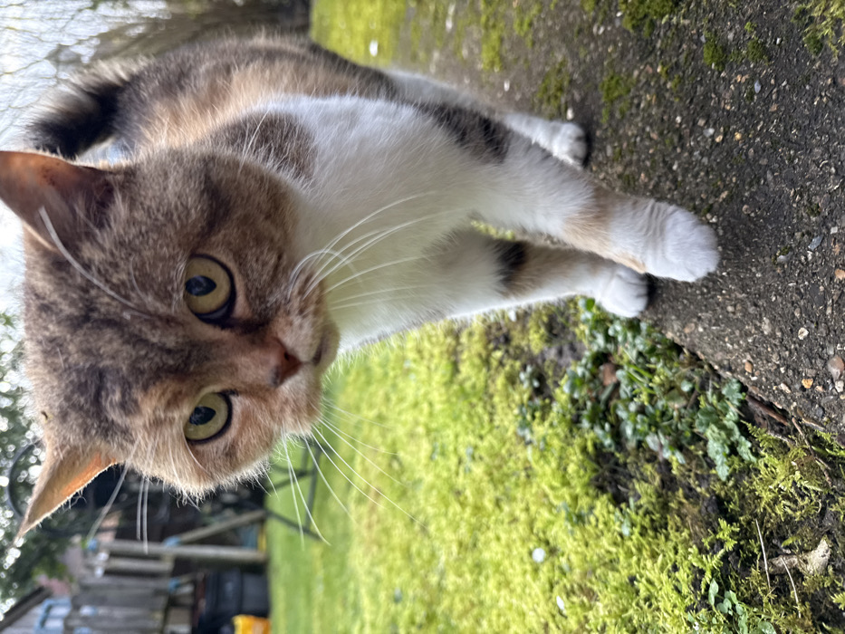 - "A domestic cat, displaying a tortoiseshell coat pattern of brown, black, white, and cream fur, is depicted mid-stride, walking on a concrete path within an outdoor garden" by FM-1SOEV2, licensed under CC BY 4.0
