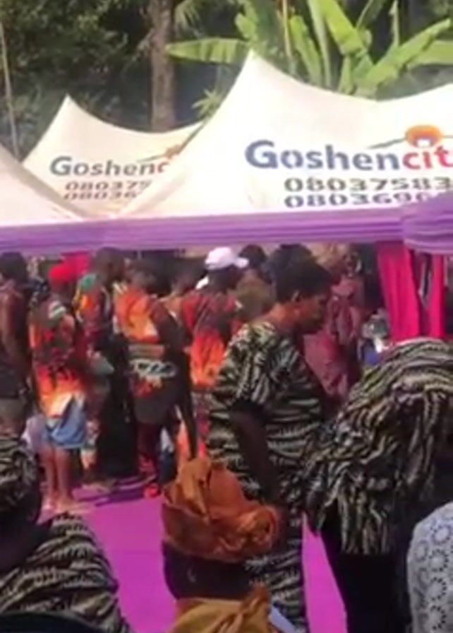 n outdoor event, possibly a celebration, under white tents with purple trim and the name "Goshencity" printed on them. People are dressed in colorful, patterned clothing, gathering and moving around. Some are dancing, while others are interacting near tables and chairs. The scene is filled with activity and the sound of music or talking is implied. The camera moves, showing different parts of the event and the attendees. The environment is sunny, with trees visible in the background.