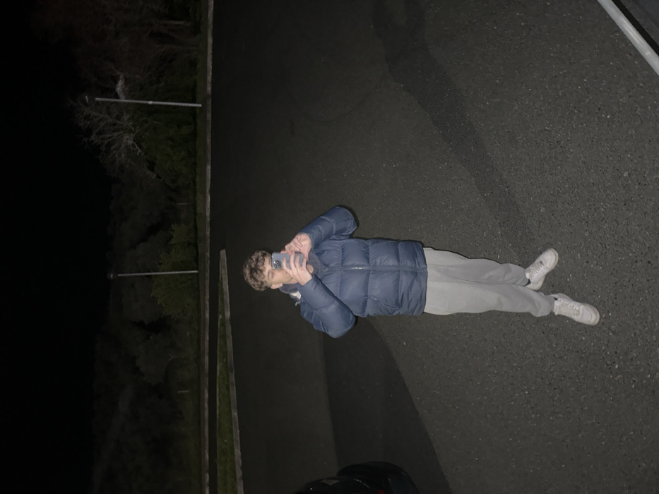 The image displays a single young male subject standing on an asphalt surface at night in Mirandela, Portugal. The subject is centrally located, dressed in a dark blue puffer jacket, grey sweatpants, and white sneakers. He is holding a dark-colored smartphone horizontally with both hands at chest level, obscuring the lower portion of his face, indicating active use of the device's camera. To the immediate left of the subject, a section of a dark vehicle's rear fender and taillight is partially visible. The background features dark trees and foliage under a night sky, illuminated by two tall, functional streetlights. Faint white painted lines are visible on the asphalt surface to the left of the subject.
