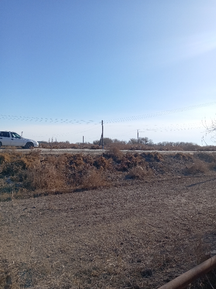 This image depicts an outdoor scene in Chimbay, Uzbekistan, under a clear, light blue sky with visible sun glare in the upper right quadrant. A raised, unpaved road or embankment traverses the midground horizontally. A white sedan, observed in profile on the left side of the frame, is positioned on or adjacent to this road. Multiple utility poles with several overhead power lines extend horizontally across the scene above the road. The midground embankment and areas beyond are covered with dense, dry, brown-hued vegetation. A distant line of deciduous trees with bare branches is visible. The immediate foreground consists of dry, exposed soil sparsely covered with withered brown plant matter. A rusty brown metal pipe or fence component is partially visible in the bottom right corner of the frame. No individuals or specific actions are present in the scene.