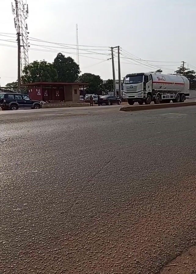 street scene, filmed from a low angle. A large truck with a white tank is driving on the right side of the road. A yellow van with colorful stripes and text on it passes in front of it. Several other vehicles, including a motorcycle, are also visible in the background, along with people walking. The scene features a telephone pole and a cell tower. The road is made of asphalt. The sky is bright with a slight haze. The name of the phone camera that recorded the video is visible on the bottom left corner.
