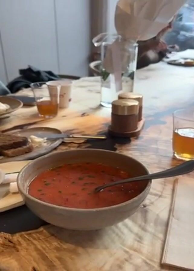 family-style meal in a restaurant or dining room. The focus is on a wooden table with several dishes, including a bowl of red soup with visible herbs, slices of dark bread with butter, and dumplings covered in a white sauce and green garnish. There are glasses with a light amber liquid, condiments in small containers, and other dining utensils. A young woman, wearing a gray sweater, is visible in the background. She is using a fork to eat the dumplings. The room has a modern, minimalist style, with light-colored walls and a window providing natural light. The overall scene suggests a casual yet refined dining experience.