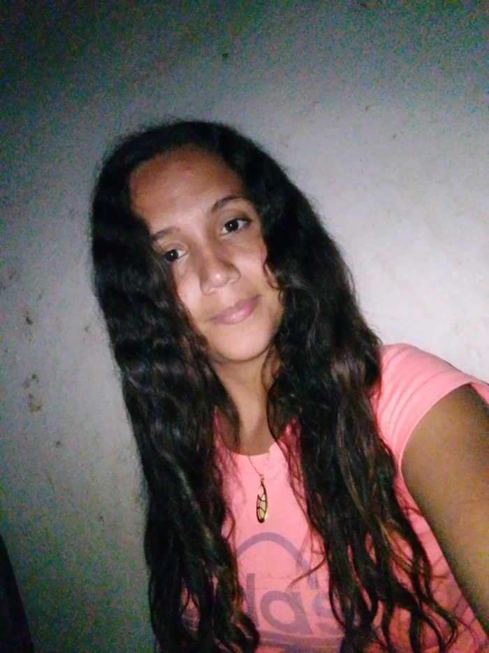 A female subject is depicted in a portrait-style photograph, positioned against a light grey, textured wall. She has long, dark, wavy hair and is wearing a coral-pink short-sleeved t-shirt. A golden-colored necklace with an oblong, abstract-patterned pendant rests on her chest. Her head is slightly tilted, and she is looking directly at the camera with a subtle smile. The lighting is dim and uneven. No specific environmental markers are present to identify a precise location within the city of Juan Griego, Venezuela.