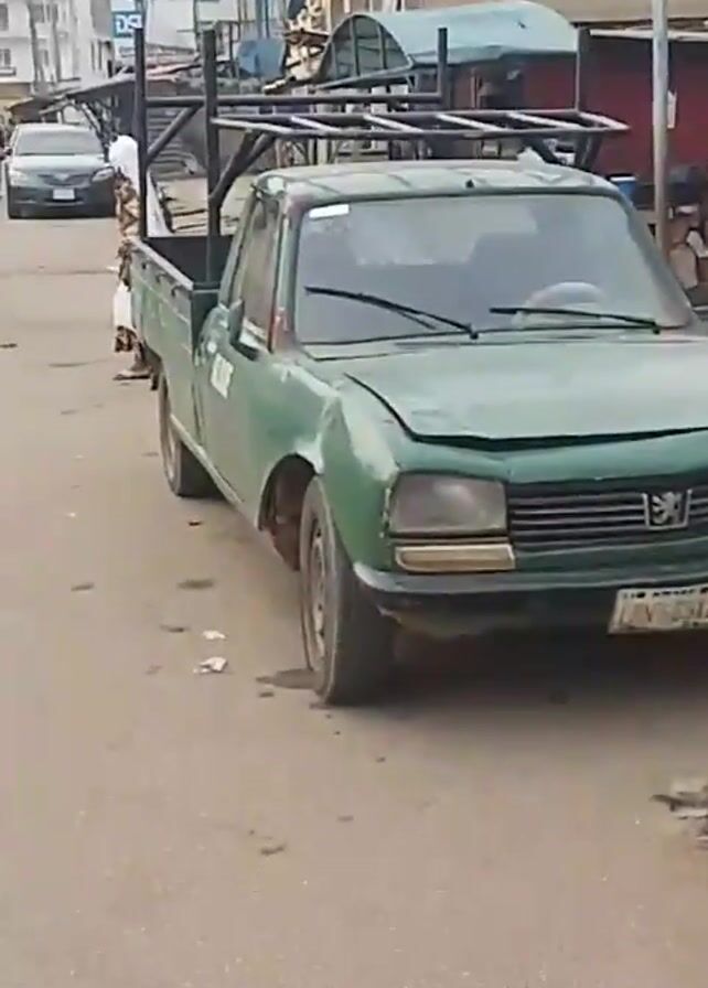 The video opens with a blurred view of a light brown surface, possibly pavement or dirt. The camera then pans upwards to reveal a street scene in what appears to be a developing or urban area. A green Peugeot car is parked beside a sidewalk advertisement board for "AL-AGNN MINI BAR." A man is walking down the street towards the camera. To his right is a partly-constructed fence made of wood and metal sheets. Beyond the fence is a large building with solar panels on the roof. Various signs are also visible including one that reads "NEW LIFE GOSPEL CHURCH." The video ends with a view of the street and signs.