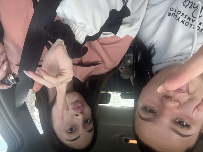 This image captures two young adult females inside a passenger vehicle, located in Tvarditsa, Bulgaria. The perspective suggests a selfie, with the camera held by one of the occupants. The female on the left, positioned closer to the camera, has dark hair. She wears a light-colored hooded sweatshirt with partial text reading "FOLLOW YOUR DREAMS GO TO Paris". Her head is slightly tilted, and she looks directly at the camera with her mouth slightly open, tongue partially visible. Her right hand is raised, with the index finger extended. The female on the right, partially visible behind the female on the left, has long dark hair and wears a peach/pink, white, and black color-block jacket. She is secured by a black seatbelt that diagonally crosses her torso. She looks directly at the camera with wide eyes and pursed lips. Her left hand is raised, forming a V-sign with the index and middle fingers extended. A ring is present on her left ring finger, and a black scrunchie is on her left wrist. Her fingernails are painted a light, shimmering color. In her right hand, she holds a small, dark, reflective cylindrical object. The vehicle interior is visible, with rear headrests and a glimpse of the exterior through the back window, showing bare trees. A small, light-colored, shaggy stuffed animal is present on the rear seat.