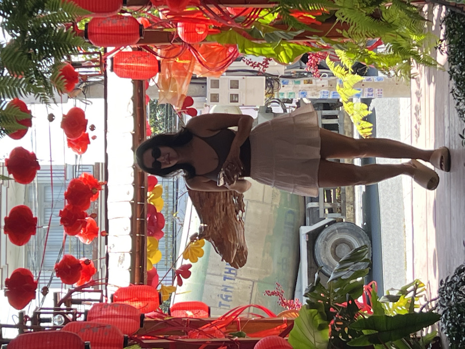 A woman in sunglasses, a dark top, and a light-colored skirt stands on a sidewalk. She's next to a tree-trunk-shaped decorative element. Red lanterns and floral decorations create a festive atmosphere overhead. Behind her, a large truck with a visible tire is parked. The scene is a mix of urban and decorative elements.