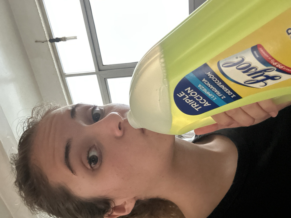 A close-up image depicts a young female, visible from the chest up, situated indoors, likely in Mexico City, Mexico. She has light skin, dark hair tied back, and is wearing a dark t-shirt. Her eyes are wide open and directed towards the camera. She is holding a large, yellow-green plastic bottle of Lysol cleaning product, prominently displaying "TRIPLE ACCIÓN" in Spanish, along with "1. LIMPIEZA", "2. FRAGANCIA", and "3. DESINFECCIÓN". The bottle contains a matching yellow-green liquid with visible foam near the spout. The woman has the spout of the Lysol bottle pressed against her lips, appearing to sniff or simulate drinking from the container. In the background, a window with white frames is visible, showing a bright, overcast sky. A compact fluorescent light bulb or similar object hangs vertically from the upper window frame.