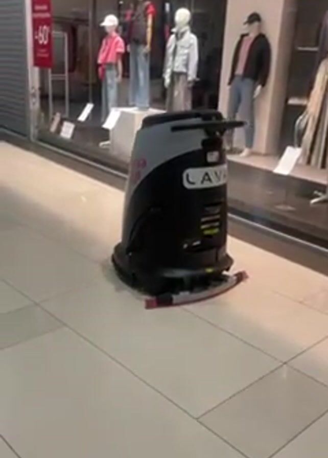 - "A grey and black Lava model floor cleaning robot slowly moves left to right across light-colored, square-tiled flooring in front of storefronts inside a mall" by FM-KIPqC3, licensed under CC BY 4.0