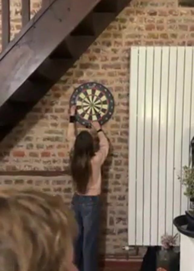 A young girl is throwing darts at a dartboard hanging on a brick wall in a room that has a staircase, radiator, a cabinet or bookcase, and a shoe rack. She steps back and another child walks in front of the camera.
