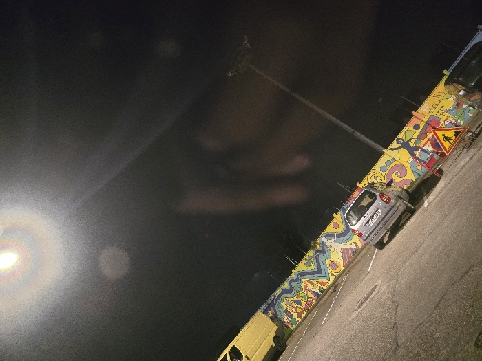 A long, colorful mural lines a street with parked cars, a yellow van at one end, a silver vehicle further up. The mural features vibrant, swirling patterns and a 'children crossing' road sign. Overhead, a street light and pole are visible against the dark sky. The photo appears to have been taken at night and is rotated so that the right side of the image is the horizon.