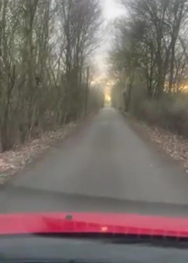The view from inside a red car shows a grey asphalt road. The road is bordered on either side by trees without leaves. The sky is grey, and there appears to be sunlight on the horizon. There is a slight upward slope in the road.